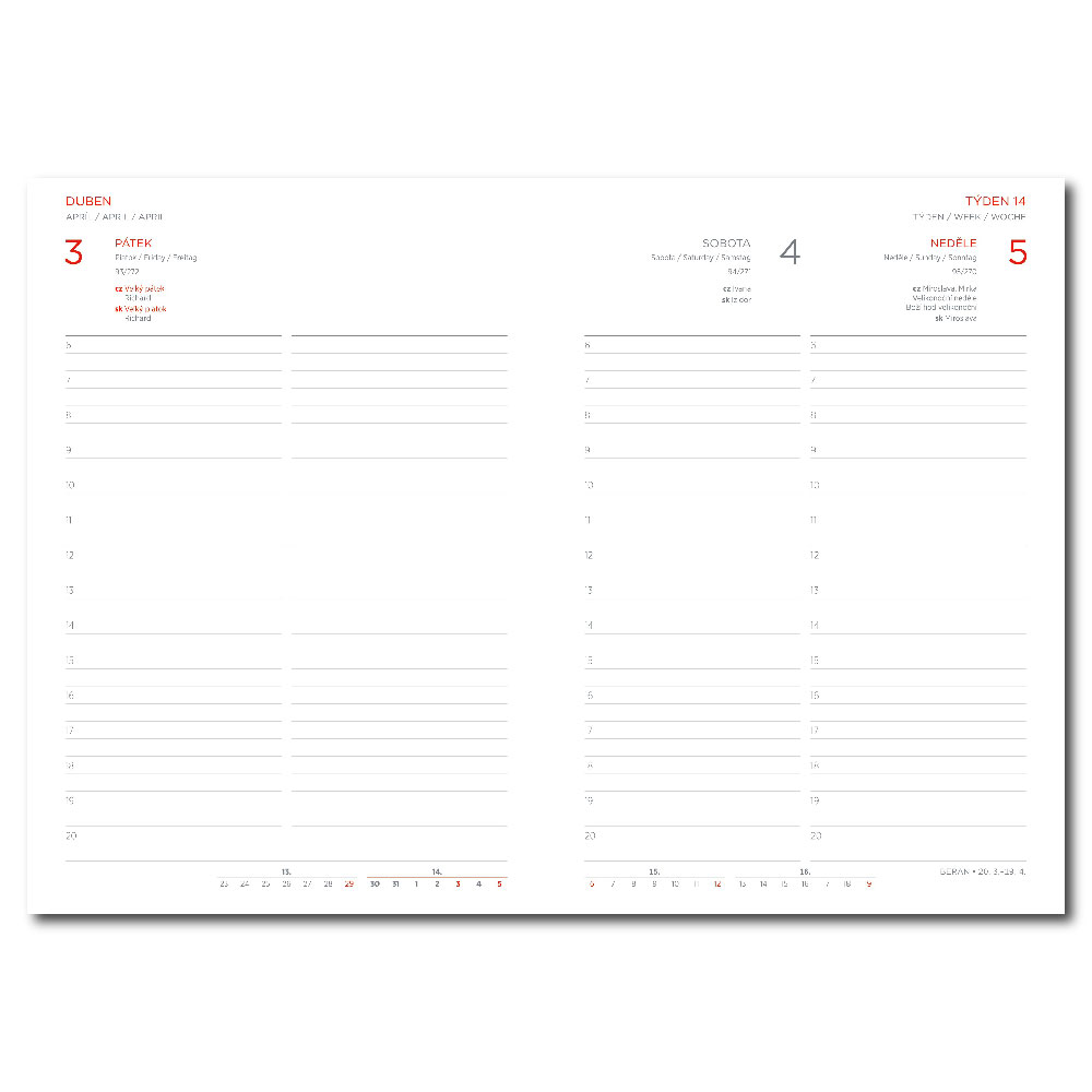 Rozměr: 148 x 210 mm – Kalendárium: české denní – Rozsah: 336 stran – Papír: bílý – Materiál desek: kůže – Hlavní jazyk: čeština – Další jazyky: SK, EN, DE