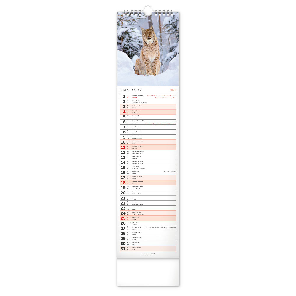 Rozměr: 12 x 48 cm – Kalendárium: české/slovenské se jmény – Rozsah kalendáře: 14 listů – Vazba: dvojitá spirála – Plocha pro potisk: 12 x 6 cm